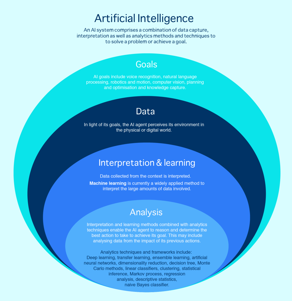 “Artificial intelligence (AI) refers to systems designed by humans that, given a complex goal, act in the physical or digital world by perceiving their environment, interpreting the collected structured or unstructured data, reasoning on the knowledge derived from this data and deciding the best action(s) to take to achieve the given goal.”