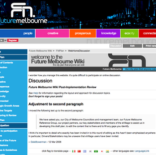 I really admired the progress that City of Melbourne was making and aiming for with sustainability transitions for the built environment and its complex systems. I was lucky enough to be able to join the City of Melbourne's Strategic Planning team and help deliver the Future Melbourne city plan, including the development of a Wiki platform for the drafting of the plan. It was a world first, representing global best practice in stakeholder engagement and technologically innovative policy making using an open source Wiki website and content management system throughout the process. The work was awarded the Planning Institute of Australia President's Award jointly with a project of City of Sydney in 2009.